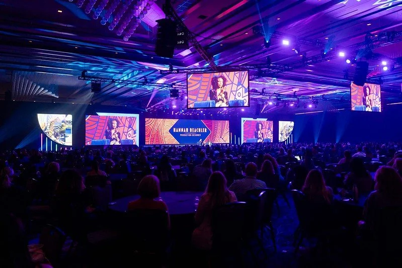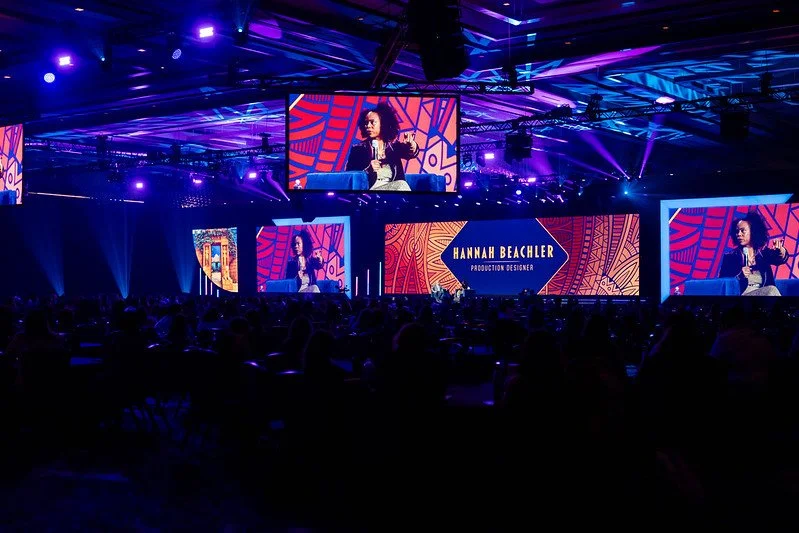 Create a visually striking and thematically cohesive stage background that enhance the overall production design and audience experience.